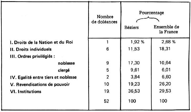Elles ont été regroupées en six rubriques de manière à pouvoir être comparées à celles de l’ensemble des cahiers de la noblesse qui avaient été ventilées selon le même principe. On peut ainsi situer la sénéchaussée de Béziers par rapport à une moyenne générale et fixer sa position dans la hiérarchie des opinions nobiliaires.