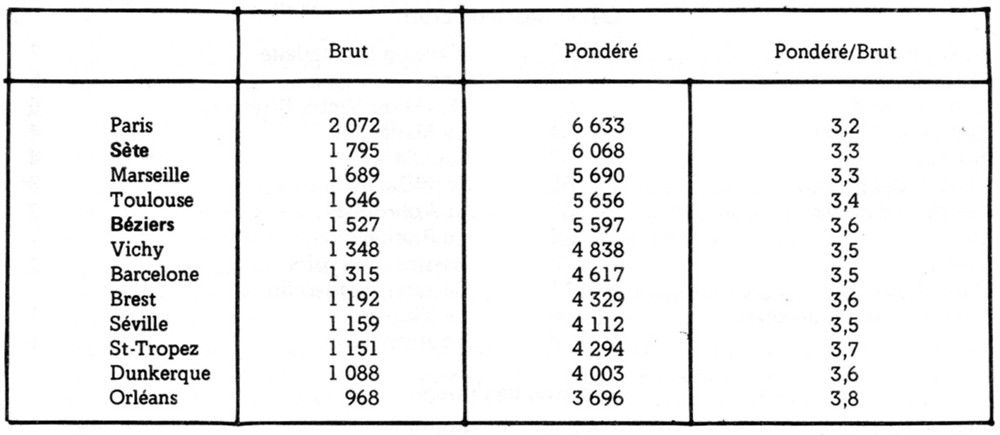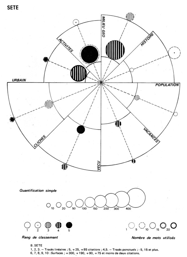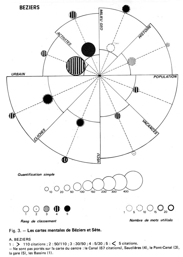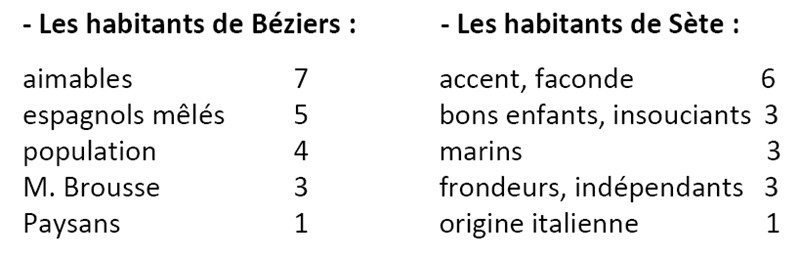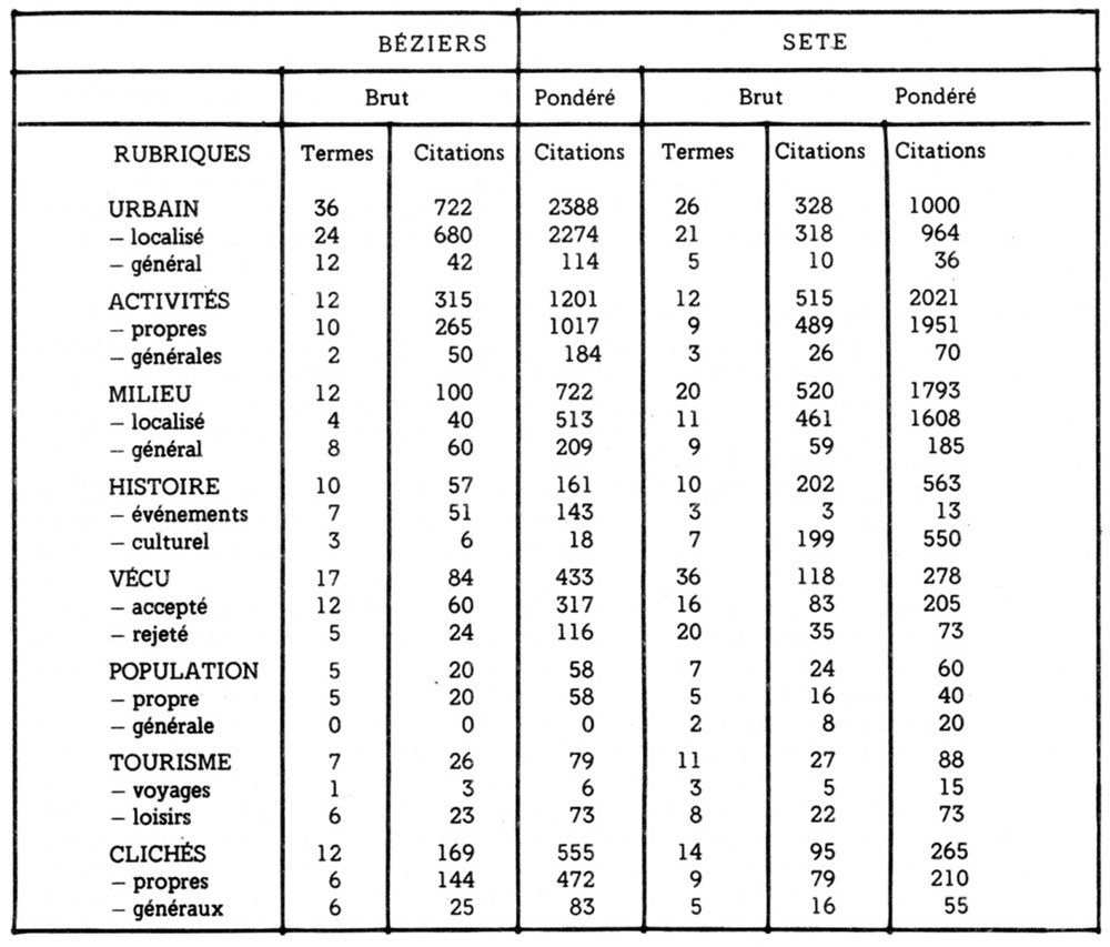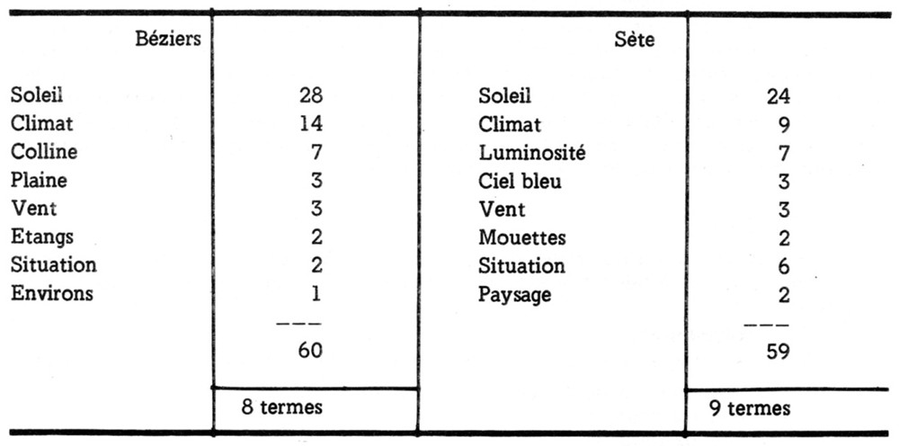 Il s’agit ici de cerner puis d’analyser les composantes de cette image de marque, au niveau d’un groupe à peu près homogène auprès de qui a été menée une enquête. Il s’agit de Retraités de l’Éducation Nationale, membres de la M.G.E.N. (Mutuelle Générale de l’Éducation Nationale), tous installés dans le département de l’Hérault. L’enquête a fourni 512 réponses au total, dont 503 pour la partie réservée à Béziers et 502 en ce qui concerne Sète 2. Ce sont les réponses à la question : « Si l’on vous indique un nom de ville, quelles sont les idées qu’elles vous suggèrent ? En porter cinq au maximum et de façon spontanée, l’essentiel étant pour nous les associations d’idées », qui sont exploitées ici au niveau des deux villes de Béziers et Sète 3.
