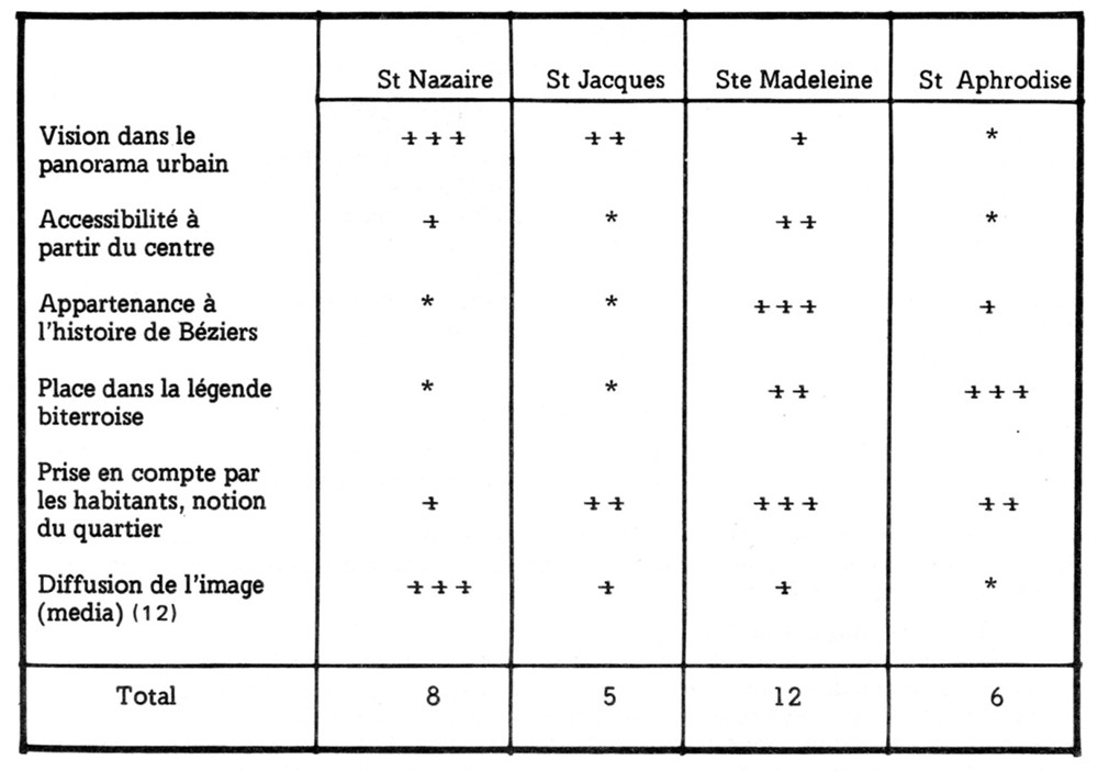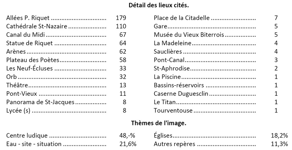 La pondération nous donne l’image « renforcée » 8 de la ville avec en tête (donc côtés 5 chaque fois) : les Allées (76 fois), Saint-Nazaire (31), P. Riquet (20), le Théâtre (4), la Citadelle (3) ; alors que la dernière image, citée une seule fois et cotée seulement 1 est celle de la piscine.