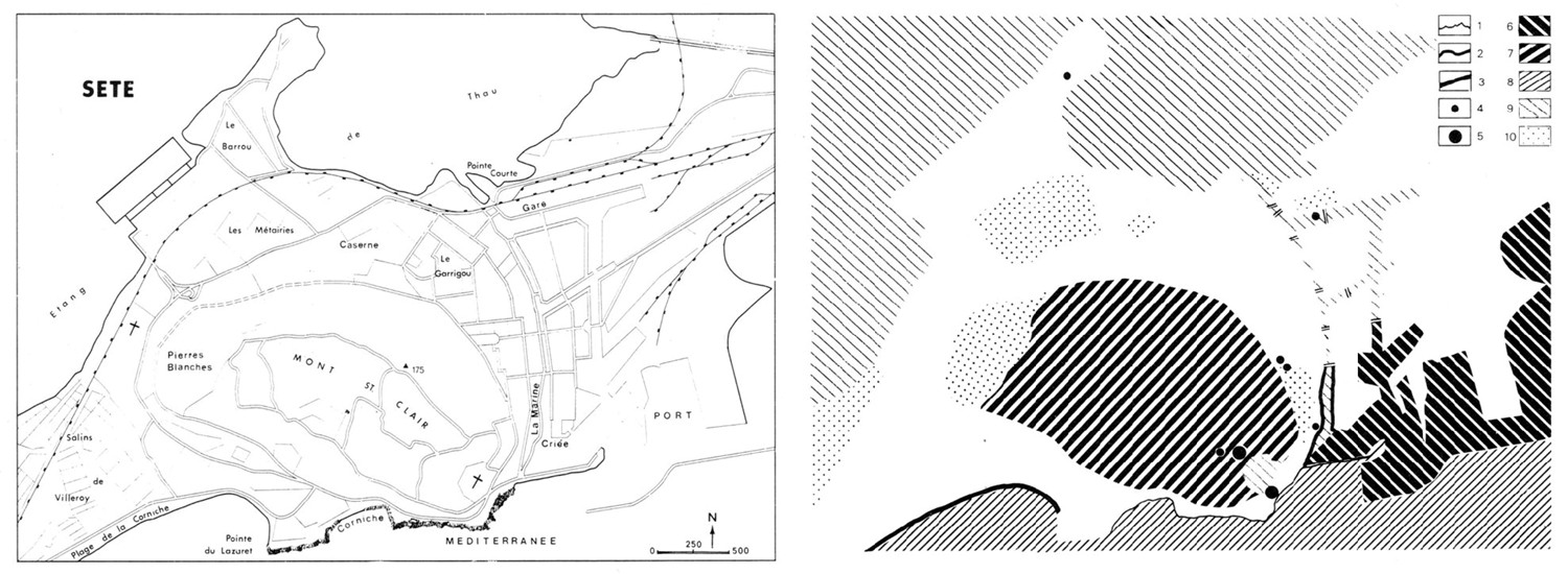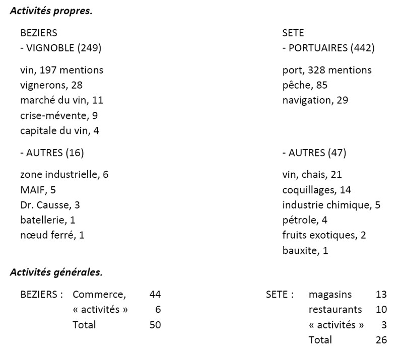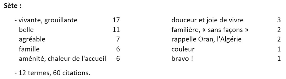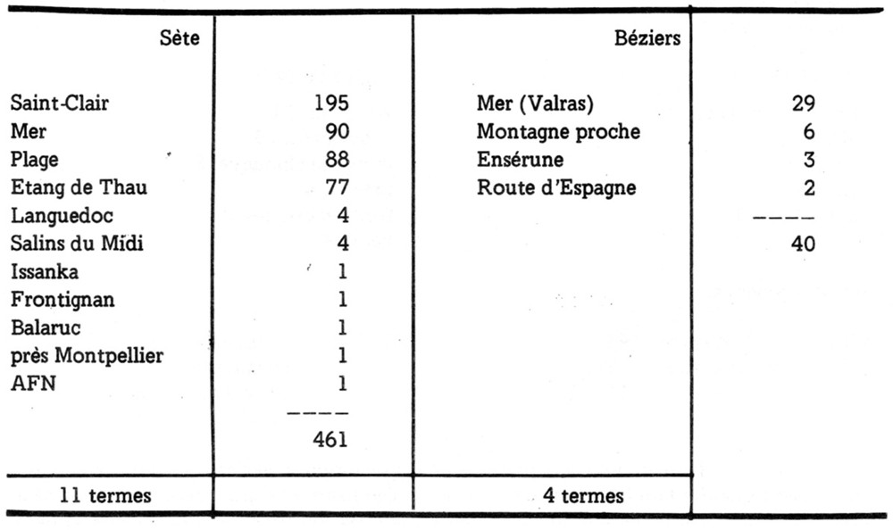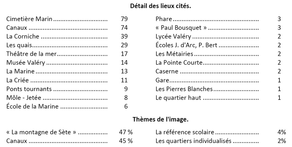 - Pour Sète : le rôle du milieu géographique bien typé par le Saint-Clair, la mer, l’Étang, devançant les activités (le port) et l’urbain localisé. La place importante de l’histoire culturelle, par opposition à l’histoire événementielle, à peu près inexistante. La faiblesse – déjà notée pour Béziers – du secteur « vacances » 18.