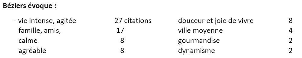 - Pour Béziers : la place prépondérante des éléments du paysage urbain localisés devant les activités propres à la ville et les clichés. La prédominance d’une activité citée en tête (rang de classement 5 traduit en noir) : il s’agit du vin ; la faible part du secteur « vacances » dû au fait que les questionnés résident sur place et ne perçoivent pas la ville sous cet aspect.