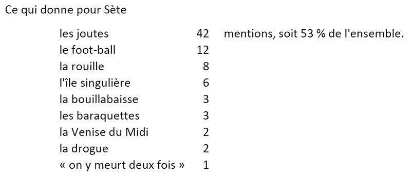 Chacune des composantes mérite quelques éclaircissements, les joutes font l’unanimité, présentes au Musée, popularisées par Desnoyers et les peintres de Sète, peu pratiquées en dehors de Sète et des environs, inséparables des fêtes de la Saint-Louis, etc. Le football reste révélateur de l’âge des enquêtes, car il s’agit de l’évocation de succès et de titres anciens, au niveau national. Rouille et bouillabaisse se trouvent curieusement réunies, la deuxième voulant qu’un certain nombre de restaurants du littoral languedocien s’autorisent à servir sous ce nom un poisson bouilli, noyé de sauce au safran, alors que la première reste, avec la bourride, authentiquement sétoise. Même chose pour la baraquette qui rappelle les réunions du dimanche autrefois sur le Saint-Clair avant que l’habitat permanent les ait supplantées (par le jeu du prix du terrain) : l’authenticité locale opposée à la « Venise du Midi ». La drogue enfin renvoie à la presse, l’arrivée du ferry Agadir, qui assure les liaisons avec le Maroc, se soldant par de spectaculaires coups de filet. Personne par contre ne cite la Saint-Louis sur laquelle s’axent finalement les joutes et se fait la publicité annuelle.