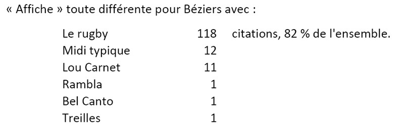 Le rugby talonne désormais le vin dans l’image de Béziers, en raison de la série de succès accumulés par l’équipe locale, et encore l’enquête a-t-elle été réalisée en janvier-février 1977, avant que Béziers ne récolte une nouvelle fois, et entre autres, le titre de champion de France. Lou Camel : le chameau, symbole de la ville, renvoie à la légende de St Aphrodise, précédemment évoquée. La rambla c’est encore les allées, citées dans leur « tonalité barcelonaise » ; le bel canto renvoie à Saint-Saëns et aux créations d’avant la guerre ; les treilles restent une des rares danses folkloriques du Languedoc encore pratiquée à l’occasion des fêtes.