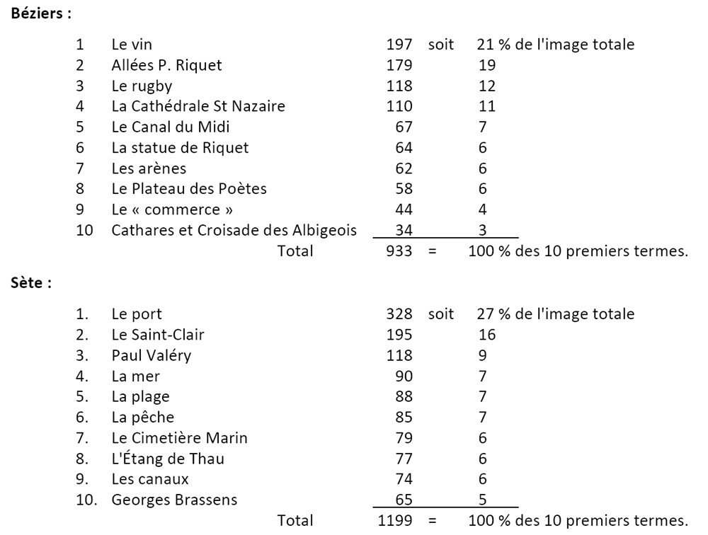 Voilà au total et selon les thèmes choisis comment se composent les images de Béziers et de Sète, que l’on peut synthétiser, hors des classements établis, par le tableau suivant qui ne conserve que les 10 premiers termes les plus employés pour chacune des deux villes.