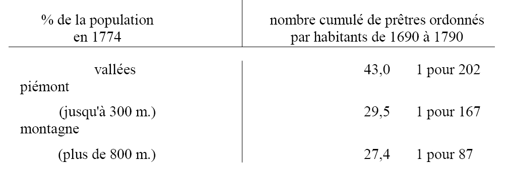 Au temps de la Contre-Réforme, dans un tissu paroissial aux cellules nombreuses, et parfois microscopiques, chaque paroisse a son curé à demeure assez souvent il est assisté d’un vicaire. Les toutes petites paroisses de 10, 20 feux qui ne sont pas légion mais qui existent, ont aussi leur curé titulaire. La raison en revient à la densité du nombre des prêtres séculiers. Dans le diocèse de Viviers, par exemple, d’après nos calculs, en 1693 il y a 1 prêtre pour 220 habitants, en 1774, 1 pour 259. Mais recrutement massif ne signifie pas recrutement géographiquement homogène. Les hautes terres fournissent le gros du contingent des curés, non seulement pour les diocèses d’origine, mais aussi pour les diocèses voisins, particulièrement ceux de la plaine du Bas-Languedoc, moins « productifs » si l’on peut dire. C’est ainsi qu’une part non négligeable des prêtres des diocèses de Vabres, Castres, Le Puy, Viviers coule vers la plaine languedocienne littorale ou les vallées intérieures 3. Dans le diocèse de Viviers où l’on a des données chiffrées, le recrutement géographique est le suivant :