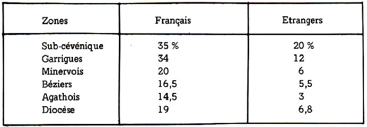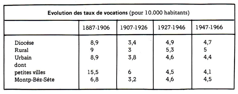 On peut discuter du critère des vocations pour exprimer la ferveur. Cependant, et bien qu’à partir de 1880, le sacerdoce ait perdu beaucoup de ses attraits « humains », on ne constate pas de grandes variations dans l’origine sociale des vocations avant 1907 : de 1846 à 1878 ouvriers du textile et artisans assurent plus du tiers des vocations ; de même, entre 1887 et 1906, les milieux ouvriers des Piémonts, encore fortement enracinés, éclipsent le milieu agricole où le grand obstacle est « le fils unique », auquel s’ajoute, dans l’ouest, le vif anticléricalisme populaire. Entre 1907 et 1926, le recul est général (159 ordinations contre 408). La remontée (222 ordinations) est sensible dans les vingt années suivantes à Montpellier, Sète et dans le Biterrois. Entre 1947 et 1966, on compte 211 ordinations, Ganges et la Vallée de l’Hérault étant les secteurs les plus féconds.