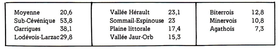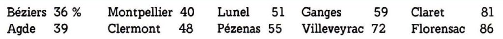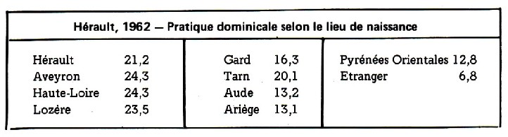 Le 2 décembre 1962, un cinquième des catholiques de l’Hérault se sont trouvés présents un dimanche ordinaire. Les écarts sont considérables d’une paroisse à l’autre … les extrêmes, Vendres 7 % et Saint-Jean-de-Buèges 80 % … parfois dans la même ville … Béziers 20,5 % à La Madeleine, 7,3 % à Saint-Jude …, mais une géographie religieuse est nettement perceptible. De même la différence entre les sexes (hommes 9,6, femmes 23,5) encore qu’elle s’atténue fortement chez les moins de 45 ans.