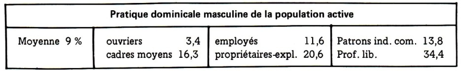A l’étiage de la pratique, l’attachement aux rites saisonniers persiste, mais la pratique régulière recule, une religion d’obligation cédant peu à peu la place à des démarches plus personnelles. Il faut noter que les hommes, dégagés depuis longtemps des attitudes contraignantes, sont plus fidèles aux pâques en 1962, qu’au début du siècle. On ne saurait isoler ce résultat du succès qu’ont rencontré les mouvements. La conscience d’être minoritaire a, de plus, un effet stimulant.