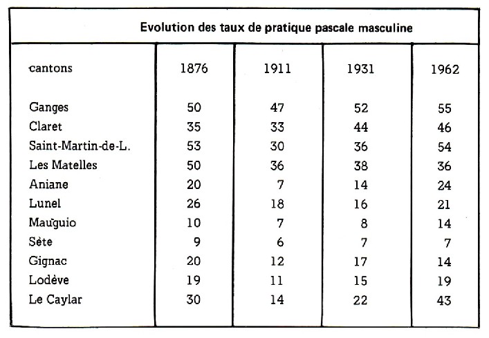 Au tournant du siècle, il semble que la pratique ait été à son apogée en de nombreuses paroisses. En 1852, elle atteint 80 % à Saint-Martin-de-Londres, 40 % des hommes et jeunes gens à Saint-Pons-de-Mauchiens en 1855. Par la suite, les contrastes vont s’accusant, résistance sinon progrès ici … à Grabels, où il y a 120 pénitents blancs, la pratique masculine atteint 50 % en 1866 … ; toutes les femmes y font leurs pâques sauf « quinze à vingt qui, néanmoins, se confessent ». Effondrement ailleurs, une comparaison des taux connus concernant les hommes et jeunes gens sur une centaine d’années, montre que le creux se situe en 1911 … probablement avant, mais on ne peut en apporter la preuve formelle. Au début du siècle en Biterrois, Minervois… les hommes font leurs pâques en cachette, « de très grand matin avant la messe » (Cazedarnes, 1907). En Biterrois, la moitié des paroisses comptent moins de 25 % de pascalisants. Dans 21 paroisses du diocèse la pratique masculine est nulle.