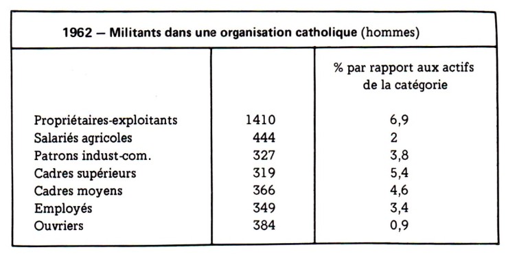 A l’homme d’œuvres a succédé le militant, qu’un Jean Coulazou a préfiguré. L’enquête dominicale de 1962 montre que la moitié des militants adultes appartient à une profession agricole. Le déficit en militants ouvriers est considérable. A Montpellier, plus d’un militant sur deux est un cadre.