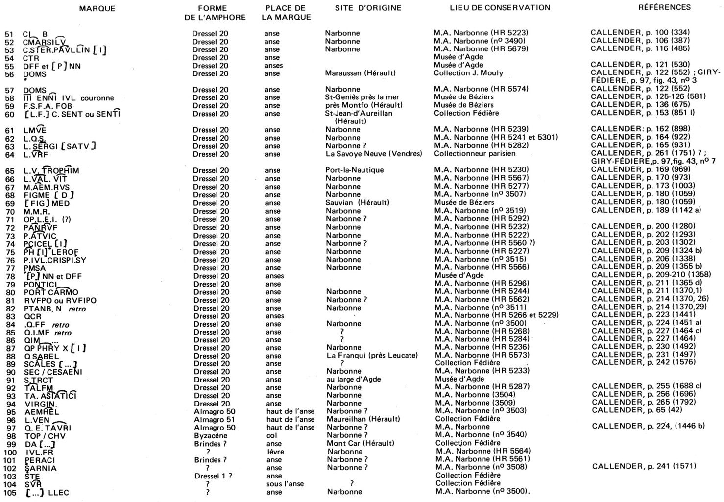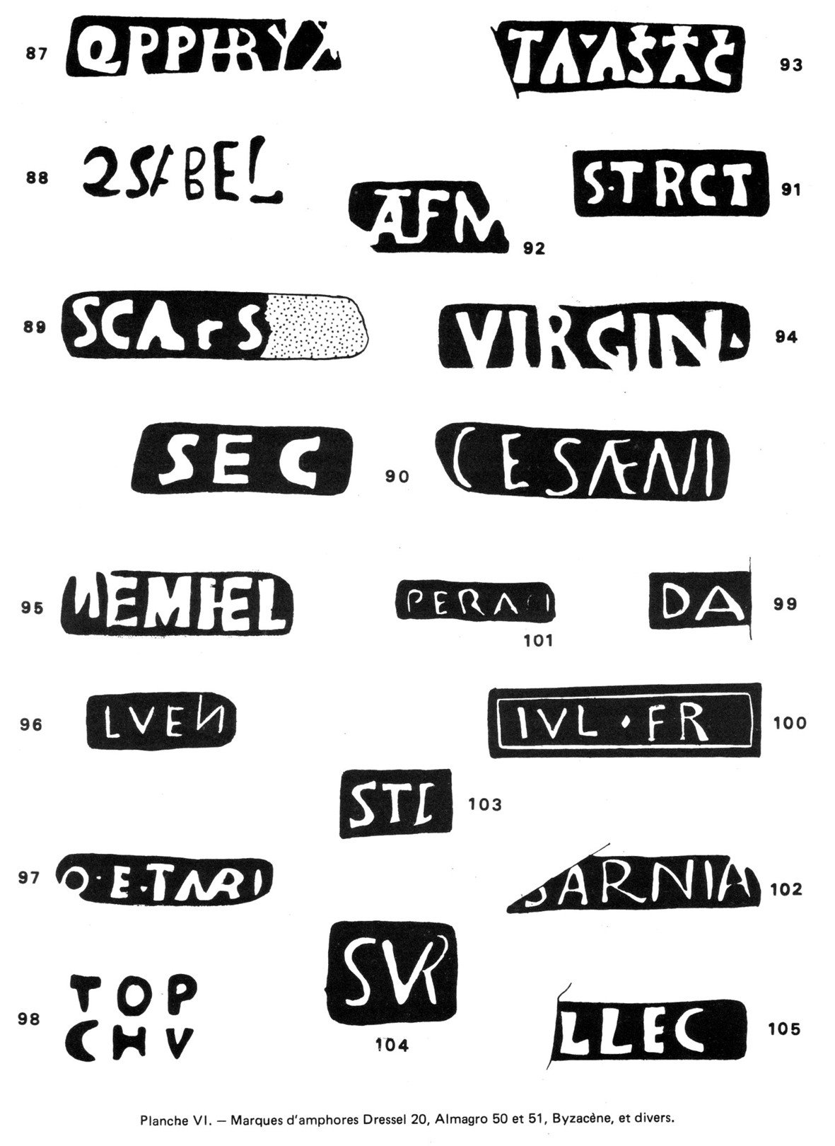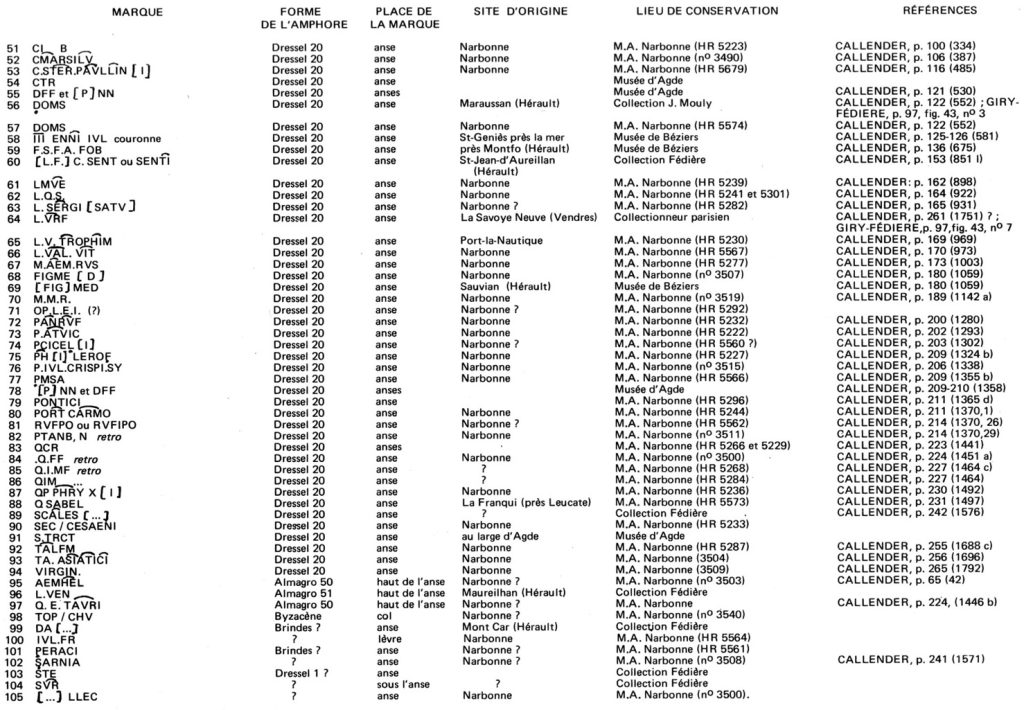 Nous avons regroupé à la fin les marques fragmentaires ou entières dont nous n’avons pu identifier avec certitude le type du support et qui ne sont pas recensées dans les ouvrages de base. Dans cette série peu abondante, nous attirons plus particulièrement l’attention sur le n° 99 et 101 qui peuvent appartenir à des amphores de Brindes ; le caractère fragmentaire de la première DA […] pouvant être rattaché à la série des marques DAMA) 23 et le fait que la seconde n’a pas été encore signalée dans le Sud de l’Italie nous ont empêché de les rattacher aux marques qui proviennent à coup sûr de Brindes.