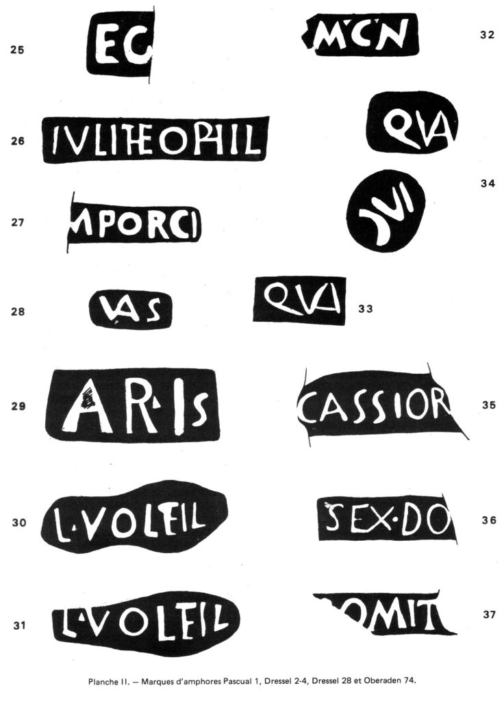 Trois des marques Dressel 2-4 ne constituent que de nouveaux exemplaires de marques bien attestées : L. VOLTEIL, MCN, QVA. En revanche, nous n’avons trouvé aucun parallèle pour les deux autres AR.IS et QVAIVC : nous les considérons comme inédites.
