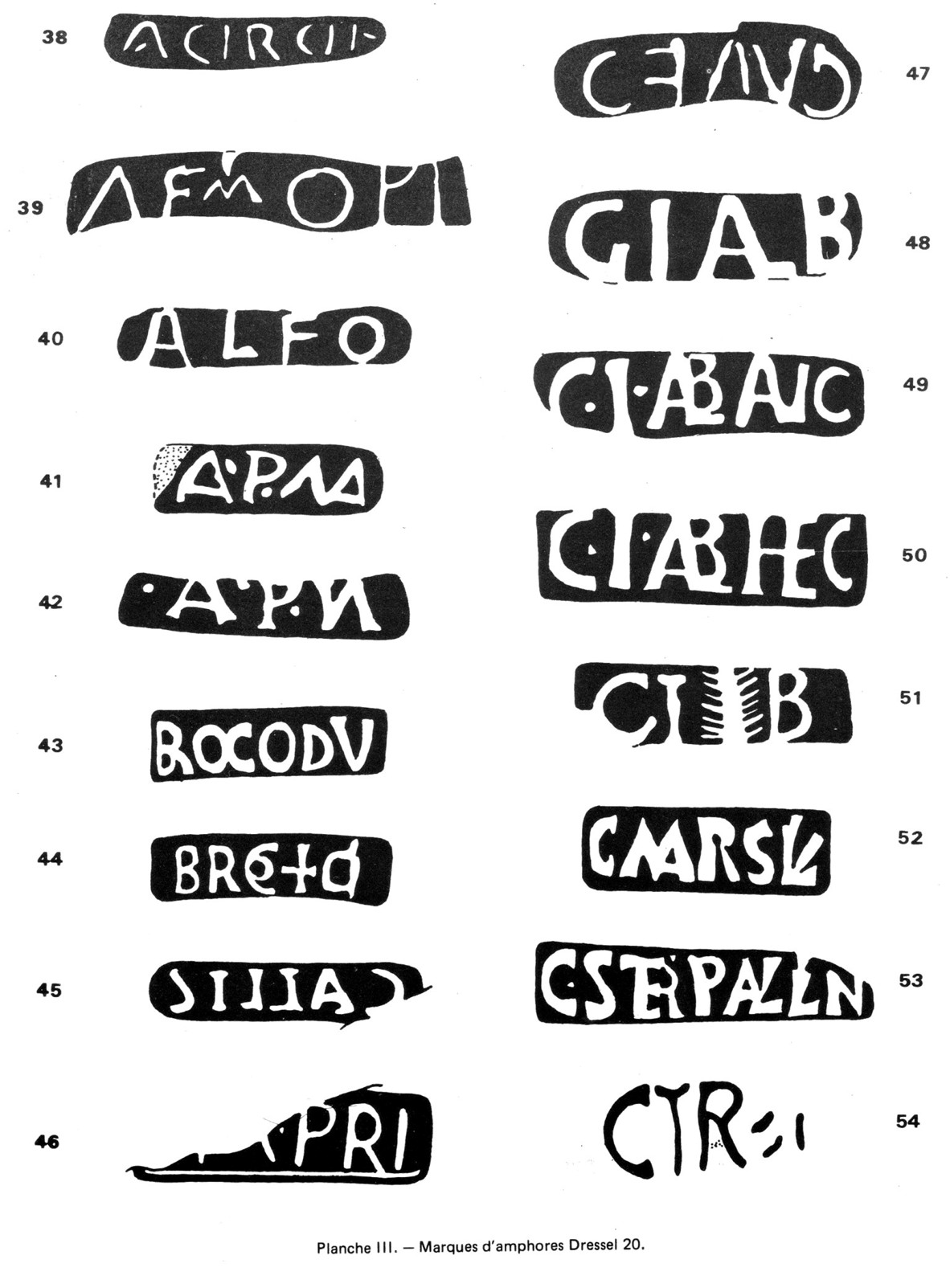 Nous jugeons utile de faire connaître les résultats de cette mission aux archéologues de la région qui, par leurs recherches, leurs fouilles et leurs prospections, sont amenés à compléter cette collection. Pour éviter un catalogue descriptif, long et ennuyeux, nous avons choisi de présenter les marques sous la forme de tableaux, accompagnés de dessins de chacun des documents (sauf les numéros 10 et 11). Les conventions adoptées dans l’illustration allègent les renseignements donnés dans les tableaux : les marques sont dessinées grandeur nature les lettres en relief apparaissent en blanc sur fond noir, les lettres en creux en noir sur fond blanc. Dans un bref commentaire, sont réunis les problèmes d’interprétation qui se sont posés à nous, les nouvelles lectures et les marques inédites.