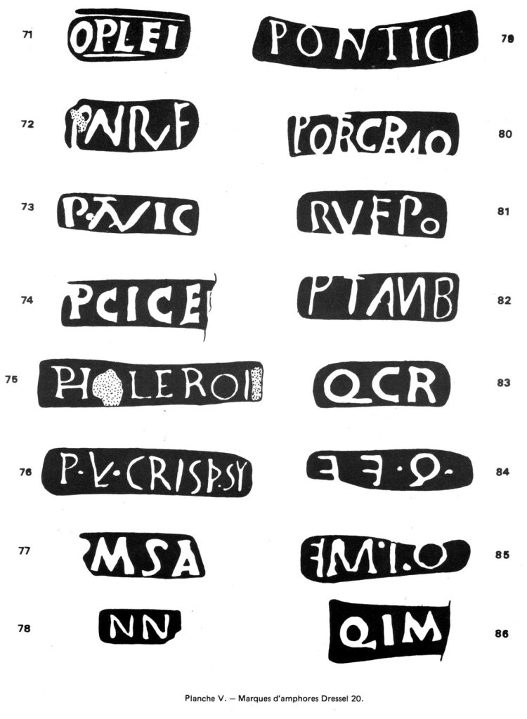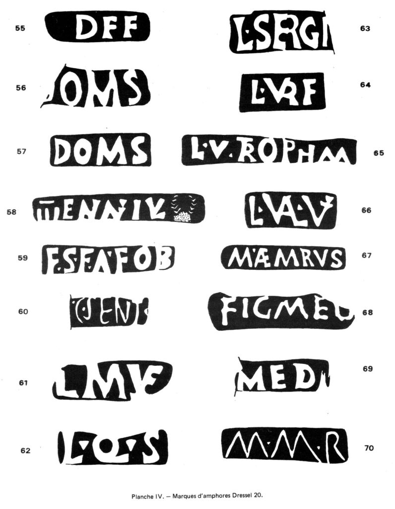 Les marques d’amphores Dressel 20 constituent l’essentiel de notre collecte. La plupart sont déjà recensées dans Callender. Toutefois quelques-unes nous paraissent encore inédites, tout au moins dans la bibliographie la plus courante, par exemple la marque n° 39 AEMOPT dont la lecture peu évidente ne permet pas une identification certaine : le E est incomplet, pourrait être lu F, le M nettement plus petit que les autres lettres, et la dernière lettre peut être aussi bien un I qu’un T. Pour notre part, nous y verrions AEM (ili) OPT (ati).