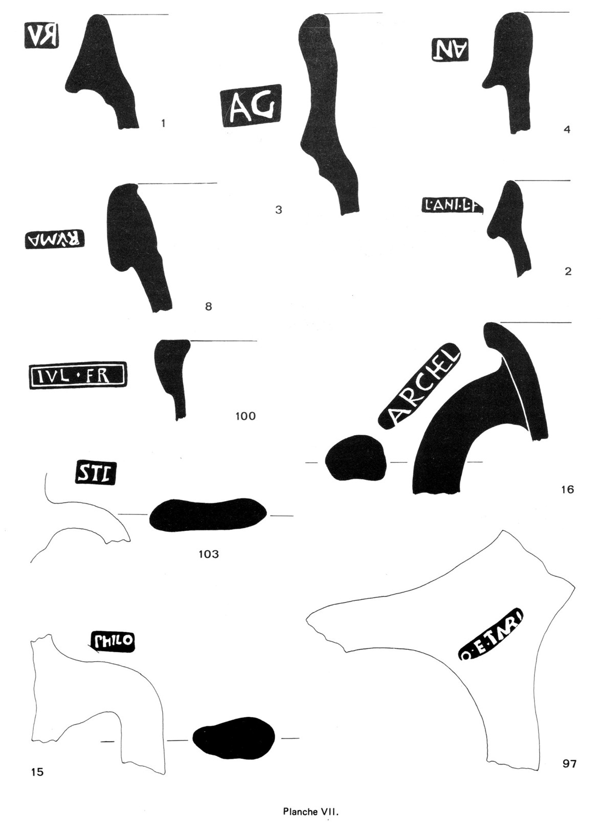 Nous regrettons de n’avoir pu identifier le bord de l’amphore portant la marque n° 100 IVL.FR en raison de la qualité assez exceptionnelle du poinçon ; les lettres petites et bien dessinées sont encadrées d’un filet en relief parfaitement régulier. La marque SARNIA située sur le dessus d’une anse ne peut être rattachée aux amphores Dressel 20.