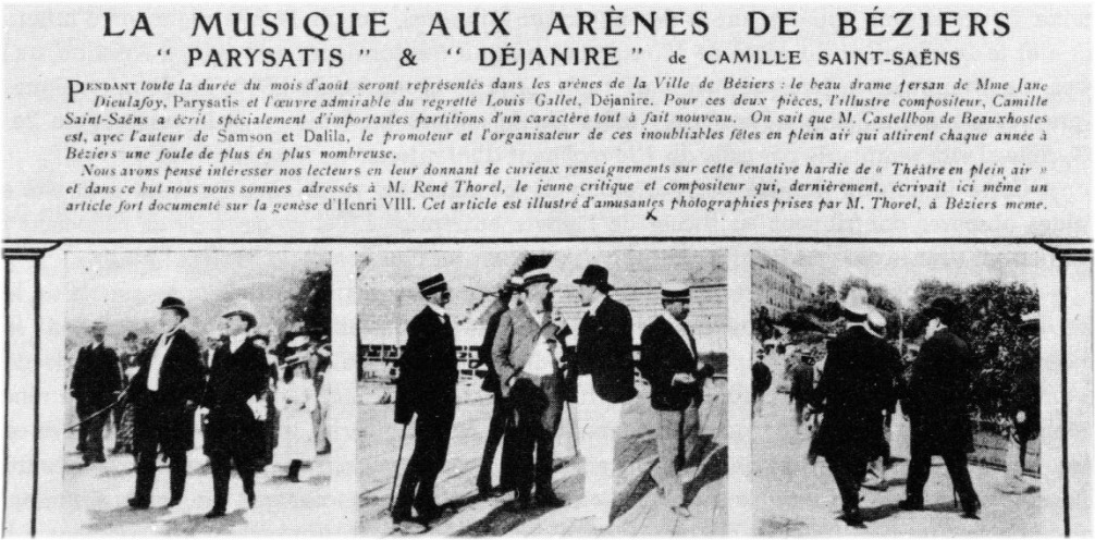 Comme précédemment, voici le récit du critique René Thorel qui a le mérite de se situer en 1903 ; il a été publié dans le journal Musica : « Bientôt la voiture qui amenait Saint-Saëns s’arrêtait devant la grille des Arènes et l’on vit alors le plus comique des spectacles. Les musiciens attendaient sous des parapluies Sans perdre de temps, M. Castelbon voulut faire jouer la « Marche héroïque » du maître, mais celui-ci préféra une polka. D’une oreille distraite, il écoutait cette musique rythmée, persuadé que le projet de son ami était irréalisable, mais peu à peu l’on put lire sur sa figure le vif intérêt qu’il prenait à cette audition. La polka terminée ce fut le tour du violoniste qui joua son morceau sous un parapluie, puis celui du chanteur. L’acoustique était merveilleuse et l’on ne perdait pas une seule note ; cette fois, la figure de Saint-Saëns s’illumina toute joyeuse : la partie était gagnée et brusquement le maître se précipita vers son ami : « Vous aviez raison, mon cher Castelbon, lui dit-il tout ému, c’est vraiment admirable ; il y a quelque chose de superbe à faire dans ces Arènes, j’y réfléchirai ! ». Une demi-heure après, l’auteur de Etienne Marcel » prenait l’express pour Paris, accompagné de M. Castelbon qui avait tenu à le suivre pour mûrir ce projet. Et quelques jours après cette visite décisive aux Arènes, C. Saint-Saëns et M. Castelbon de Beauxhostes dinaient ensemble à Paris chez Louis Gallet »