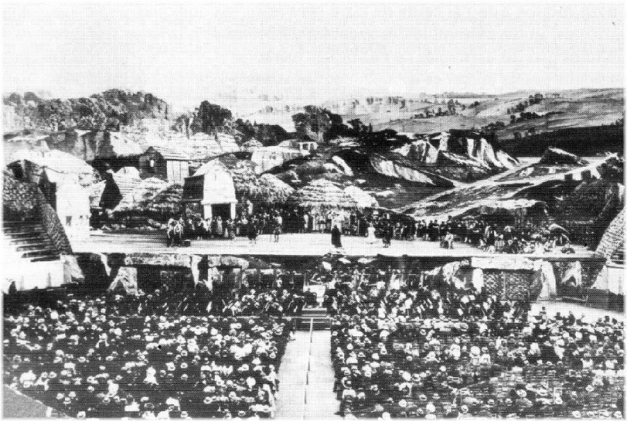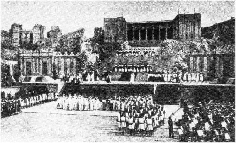 Plus de dix mille spectateurs emplissent les gradins de l’amphithéâtre inachevé. Ils voient le décor du premier acte qui représente la façade du palais d’Oechalie. Au bord de la piste, est installée la masse orchestrale que dirige personnellement Saint-Saëns, – en pantalon clair, corps d’habit mais casque colonial le compositeur est armé en guise de baguette de chef d’orchestre, d’un long bâton de bambou recouvert de papier blanc, doré aux deux extrémités par moment, Gabriel Fauré vient suppléer son maître, qui a 63 ans.