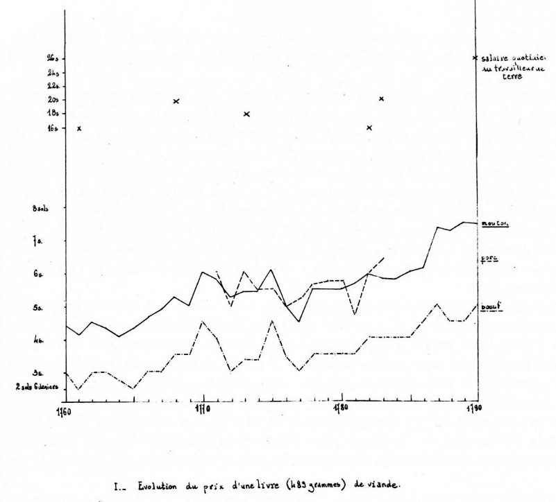 À partir de 1747, c’est le bureau de police qui fixe le prix des journées des travailleurs de terre, parce qu’ils exigent « au-delà de ce qu’elles valent eu égard au prix actuel des denrées ». Naturellement, « les sages réglemens » des consuls sont rarement du goût des travailleurs. Jusqu’en 1789, ils reçoivent officiellement de 16 à 20 sols par jour pour les hommes, et 6 ou 7 sols pour les femmes. Dans une période où le prix du pain varie de 22 à 28 deniers la livre et celui du bœuf de 3 à 5 sols, avec une tendance constante à la hausse (voir graphique I), on conçoit que les décisions consulaires aient été mal prises. Le 4 février 1751, le conseil politique propose « de voir quelques compagnies d’infanterie en séjour aux cazernes de la Grange des preds affin… D’avoir de main forte pour l’exécution des ordres du Roy et pour faire réduire les journées des travailleurs dont les prix excessifs absorbent les ressources des particuliers » 5. Dix ans plus tard, on n’est pas loin de la révolte contre les « viedazes des consuls ». « Pluzieurs officiers municipaux ont éprouvé… Dans leurs biens de campagne la malice et la méchanceté de certains, de ce que certains ont eu leurs vignes arrachées, les autres leurs muriers coupés a pied » 6. Le tarif des journées s’accompagnait de recommandations sur les abus qui s’étaient glissés dans la taille des vignes ou dans le glanage, le menu peuple cherchant à améliorer ses ressources par un maraudage constant, d’où une litanie de plaintes dans les registres du bureau de police : « Malgré les deffenses par nous faites de glaner, certaines glaneuses au mépris d’icelles auroient eu la témérité de se jetter avec impétuosité dans une terre semée… au tenement de cette ville du Puechariol et y ramasser les ollives qui etoient a terre mais meme des arbres et firent un dégat considérable dans la ditte terre » 7. « Pluzieurs personnes se sont pourvues de chevres qu’ils menent a la campagne brouter les arbres, d’autres les gardant chez eux les nourrissent avec des branches d’arbres qu’ils vont couper ou font couper par des malfaisans » 8. « Le procureur du roy demure instruit que les souches des vignes ne sont point en sureté a la campagne » 9. « Journellement on volle des fruits a la campagne, on coupe du bois et on volle aussi et on commet impunement de nuit et de jour des delits de cette nature » 10, etc. Les consuls cherchent des parades, ils établissent en 1760 des factuaires ou gardes du terroir, puis des gardes vignes, à partir de 1770 une garde bourgeoise qui modère ce genre d’activités, même si elle n’en vient pas à bout, enfin, en 1790, des gardes messiers. Nous nous proposons d’examiner l’ensemble de ces délits sous le nom de maraudage, quelque certains d’entre eux en dépassent la définition, pendant les trente années qui précèdent la Révolution.