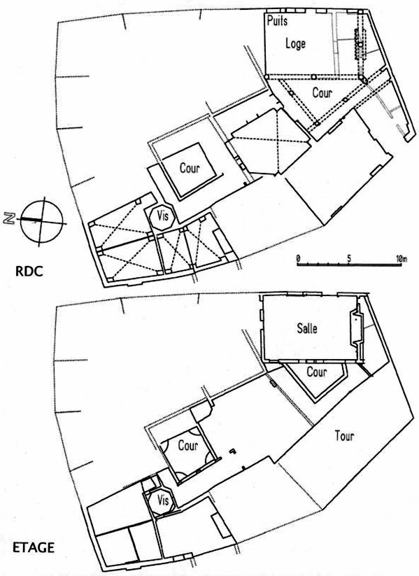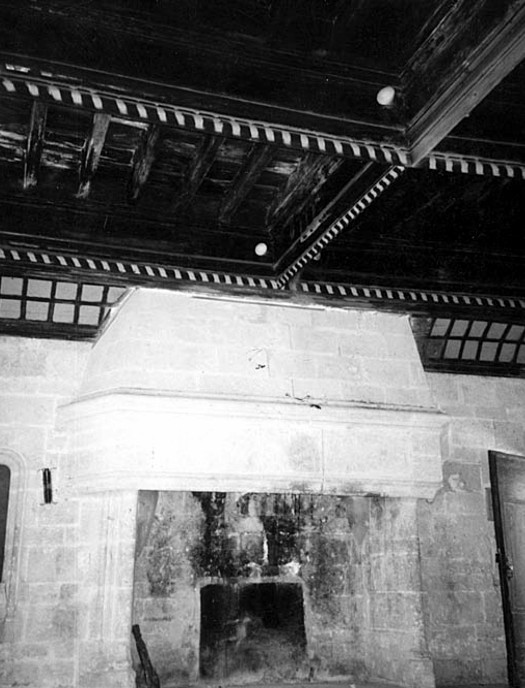 Un bâtiment (L x l x h = 12 m x 6,50 m x 12 m à l’égout), sur trois niveaux, est construit au sud-est. Il s’appuie sur le mur de clôture conservé sur une hauteur de 4 mètres. Il est constitué au rez-de-chaussée par une loge à arcs à cavets, couverte d’un plancher en bois peint (Fig. 5), au premier étage d’une grande salle avec cheminée (Fig. 6 et 7) et ouvertures à croisées (Fig. 2), portes de dégagement et plafond à caissons en bois peint. Un escalier droit dérobé derrière la cheminée mène aux combles couverts par une charpente archaïque. A cette période il faut ajouter des percements de fenêtres dans les maçonneries du 14e siècle, et un escalier à vis montant de fond en comble dans une tourelle octogonale.