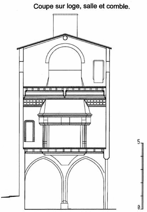 On fractionne l’espace de la loge plein cintre du 14e siècle par une maçonnerie en « bugets », (appareil de parpaings isodomes posés de chant et formant des cloisons de 15 à 16 cm d’épaisseur) pour créer de petits locaux de service. Enfin, la façade médiévale a été percée « pendant la deuxième moitié du 16e siècle d’une grande loggia corinthienne, unique en son genre dans la région » 33.