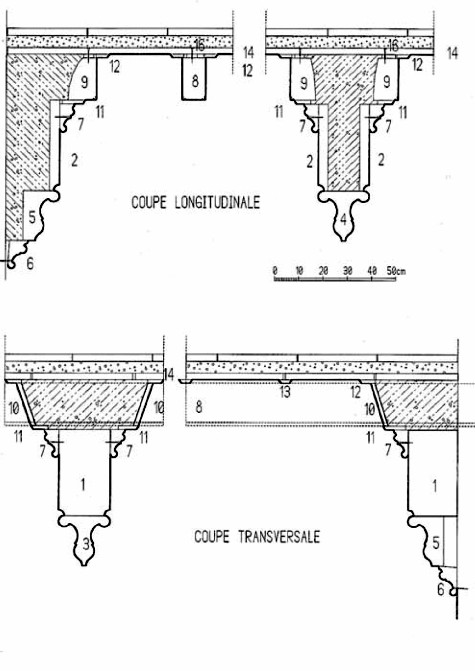 Les profils des moulures hautes et basses sont très voisins. Leur description fait appel aux mêmes mots, seules des variations légères de dimension les différencient. Ces profils sont employés sur environ 100 mètres. Ils peuvent être décrits ainsi :: une baguette à profil outrepassé sur laquelle naît une gorge à profil segmentaire de diamètre deux fois et demi supérieur suivi d ‘un filet vertical pour l’un, très oblique pour l’autre, puis d’une nouvelle baguette à profil segmentaire de même diamètre que la baguette basse pour l’un, de diamètre supérieur pour l’autre enfin un cavet du diamètre de la baguette basse suivi d’un filet oblique de hauteur voisine du premier. On note que l’angle supérieur arrière de la moulure basse est légèrement obtus pour faciliter des rattrapages dimensionnels lors de la mise en œuvre.
