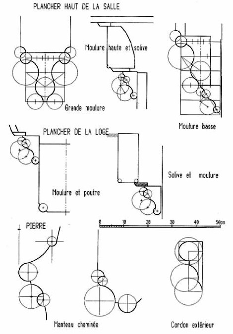 40. Ces profils médiévaux semblent procéder par combinaisons linéaires tel un langage : – On nomme a, b, c trois dimensions de cercles de tracé (petit, moyen, grand), – on associe à ces lettres les chiffres 1 et 2 pour noter qu’ils forment des moulures pleines ou creuses – on distingue trois types de rapport entre eux, l’intersection, la connexion et la déconnexion (un filet est placé entre les moulures) par les signes +, = et -, – on indique par la majuscule ou la minuscule si le boudin est amplifié ou non (ajout de nerfs). – on ajoute encore les signes > pour indiquer un profil droit, < pour indiquer un profil renversé. Ainsi les trois profils évoqués ci dessus peuvent s’écrire : – Moulure haute… > (al + e 2 – a 1 + a 2 -) – Moulure basse… > (al + e 2 – b1 + a 2 -) – Grande moulure… > (B1 – c2 + a1 + a2 -) Mais les autres moulures en pierre de l’architecture environnante (2e période) s’écrivent avec le même langage : – Le cordon extérieur : > (= a2 + e 2 -a I =) – La partie basse de la plate-bande du manteau de la cheminée : > (1 – c2 = a1+a2-) – La partie haute de la plate-bande du manteau de la cheminée : > (- a1 +b2-b1 =) < (c2+a2=) – Le linteau d’une porte (accès à escalier dérobé) : > (-a2 +b2-a1+a2-) – Les pieds droits de la cheminée (moulure verticale) : > (b1 -c2-) (-c2+a1 =b2=) – Ebrasements extérieurs des baies (moulure verticale) : > (-b2+b2-) (-b2-) – Appui saillant de fenêtre de la tour d’escalier : > (- b2 – a1 =) On remarque comme le segment > (a1 + a2-) revient 4 fois, on remarque aussi la similitude entre la grande moulure et la partie basse du manteau de la cheminée : > (B1 – c2 + a1+ a2 -) et > (b1 – c2 = a1 + a2 -), etc.