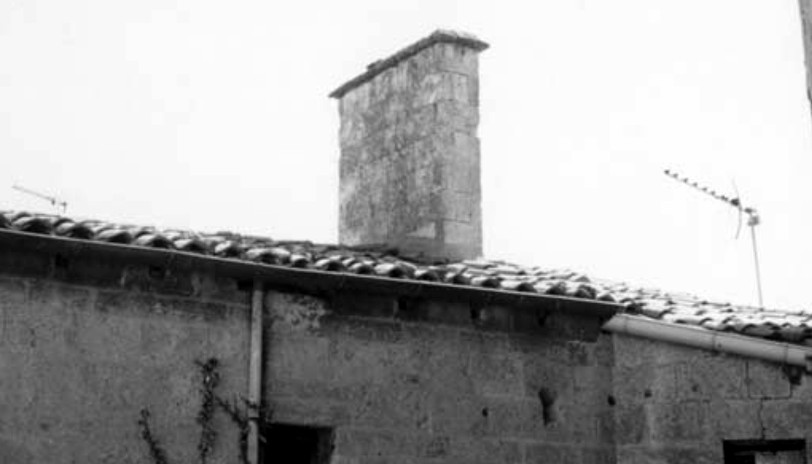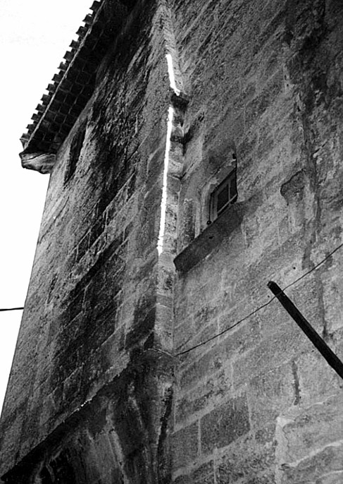 Une grande tour (L x l x h = 12,50 m à 14 m x 6,50 m x environ 15 m), crénelée est construite à l’angle sud ouest du bâtiment. Sa tourelle d’escalier sur plan octogonal sur cul de lampe, en angle sur rue, conduit de la grande salle du premier étage aux pièces de second et même jusqu’à sa terrasse sommitale. A la base de la grande tour, une porte charretière en tiers point, ornée de moulures et de croisillons, avec pierre de blason (bloc sculpté mais buché), surmontée d’une bretèche sur arc mouluré en plein cintre portée par des culots figurés s’ouvre sur une loge en plein cintre qui mène à une cour triangulaire. En face, une autre porte en tiers point, avec pierre de blason, surmontée elle aussi d’une bretèche portée par des consoles moulurées, communique avec l’extérieur mais à un niveau plus haut qui ne permet pas le passage de véhicules. A l’angle nord-ouest, c’est une cheminée saillante sur l’extérieur (Fig 3), très semblable à celle de la rue des Tondeurs (actuellement rue Montgolfier) à Montpellier, publiée en 1869 30. Un puits se trouve contre la façade est, un escalier droit, que te n’ai pas pu observer, lui est associé.