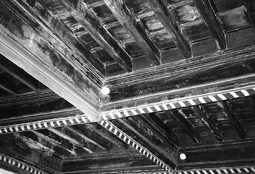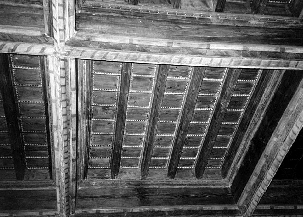 Des moulures de plus faible section amortissent l’ensemble clouées contre les murs périphériques. D’autres moulures très semblables à ces dernières assemblées à coupes d’onglet sont clouées en partie haute des closoirs et des poutres pour ceinturer les caissons et définir un plan horizontal de pose des solives. Elles sont surmontées de planchettes à bord chanfreiné de l’épaisseur des cales de pose des solives.