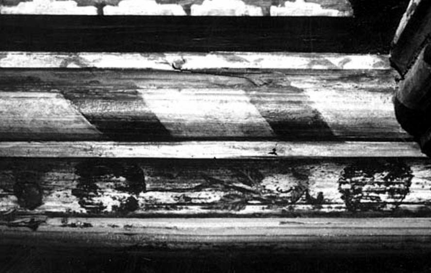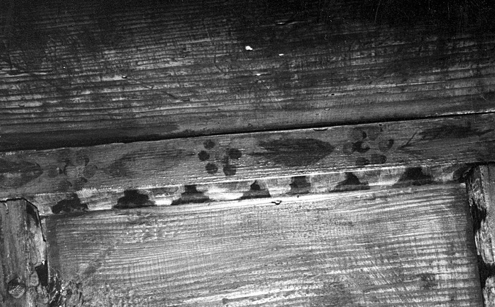 Tous les chanfreins sont peints du même motif : petites pyramides à trois degrés inversées noires et blanches. Le plat des planchettes hautes de solives et les couvre-joints reçoivent un décor de guirlande sur fond rouge : une fleur évoquée par sept touches de peinture alterne avec une feuille très discrètement nervurée (Fig. 12). Ce motif est amplifié sur le plat des planchettes basses de solives : les fleurs sont entières, leurs pétales sont dessinés, leur tige s’amortit en arabesque et porte deux feuilles nettement nervurées. Une fleur aux couleurs sombre alterne avec une autre de couleur claire. Ce motif est encore repris sur la gorge des moulures hautes (Fig. 13) dans une configuration équivalente. Les cavets des petites et grandes moulures sont peints en rouge soutenu. Sur les baguettes des petites moulures alternent des tronçons biais noirs et blancs.