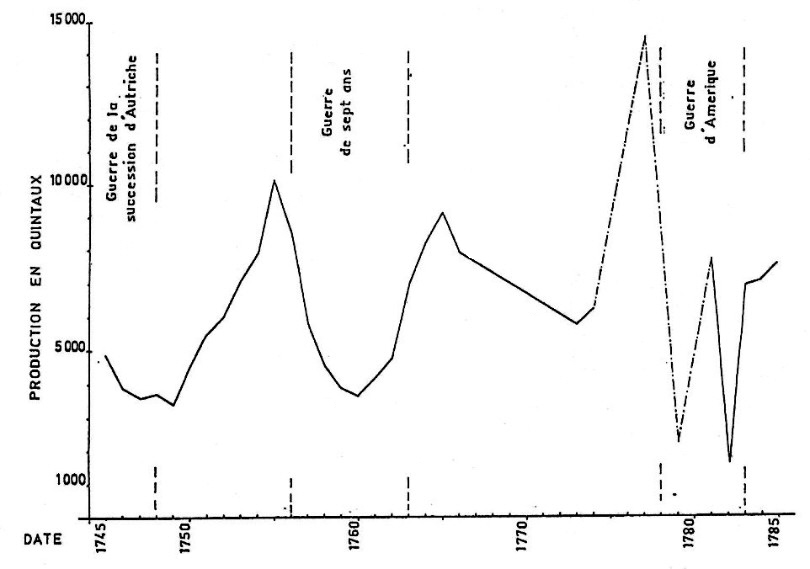 Les gains sont cependant irréguliers, productions et prix variant en fonction du climat, de la cherté des vins et de la sûreté des échanges internationaux. L’oxydation du cuivre nécessite en effet un climat tempéré et les hivers trop froids entraînent une chute du rendement des oules. « Le froid de l’hiver retarde ordinairement les caves, c’est à dire que les pots ne poussent du verd de gris en ce temps que la moitié tout au plus de ce qu’ils donnent dans un temps tempéré de printemps, d’été et d’automne. Ce retardement des caves forme une espèce de disette momentanée pour la saison ; les négociants de la ville sont pressés de demandes par les étrangers et par l’envie de profiter du départ des vaisseaux qui sont à Cette pour l’Angleterre, la Hollande et autres païs du Nord et pour être plutôt pourvus ils tiennent leurs commis au poids du Roy pour avoir la poudre à mesure qu’elle passe à la visite, chacun d’eux veut en avoir à son tour pour compléter promptement l’expédition de son bourgeois et afin d’éviter toute discussion entre eux ils tirent la poudre au sort en piquant une épingle dans un livre » 20. La cherté des vins constitue également un manque à gagner pour les fabricants de verdet. Ainsi, en 1617, les propriétaires de caves obtiennent des consuls qu’ils laissent entrer à Montpellier le vin « étranger », les vins locaux se vendant trop chers 21. Enfin, le débouché principal de cette industrie étant l’exportation, les guerres et l’interruption des échanges commerciaux avec l’étranger gênent considérablement les producteurs de verdet. Le principal client des fabricants de vert-de-gris est la Hollande. Montet écrit, dans son article de l’Encyclopédie, « en France on l’emploie beaucoup pour peindre en vert, à l’huile, les portes et les fenêtres des maisons de campagne, mais le grand emploi du verdet se fait en Hollande et dans quelques autres pays du nord » 22 – L’usage le plus répandu de la poudre de verdet consiste en « enduits, recrépissage ou peinture des maisons qu’on préserve par ce moyen d’être dévorées par l’air humide et salé » 23. Un vingtième à peine de la production se vendait dans le Royaume, le reste étant exporté par Cette ou Bordeaux. La guerre constitue donc, ainsi que le montre clairement les tableaux et schéma figurant en annexe, « le fléau de cette fabrique » 24.