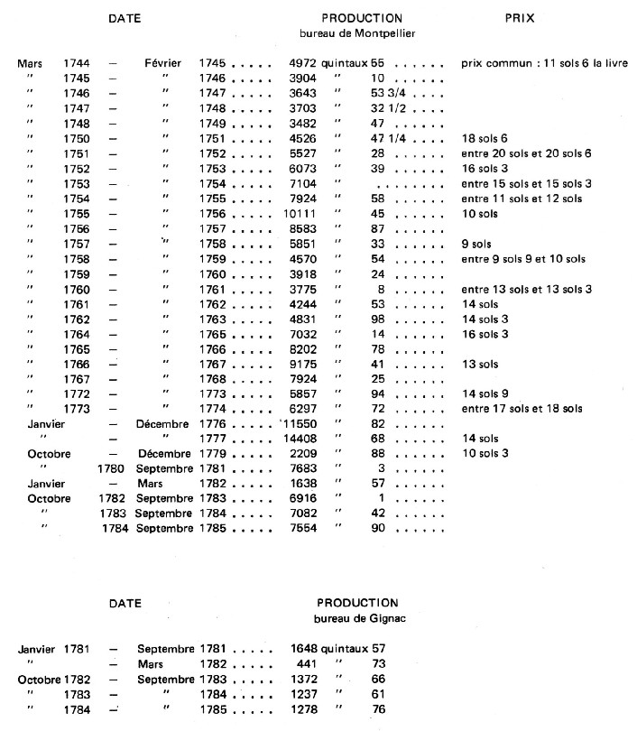« L’objet de la consommation se portait en 1711 à environ 2 000 quintaux… Nous estimons qu’il va aujourd’hui de 12 à 13 000 quintaux savoir 10 000 quintaux en cette ville et 2 à 3 000 quintaux du côté de Gignac, Saint-André et Montpeyroux… ; c’est à regret que nous la voyons s’échapper d’une ville d’où elle tire son origine pour se placer et se fortifier dans d’autres lieux… La raison de ce changement est bien sensible, le vert de gris qu’on fabrique hors la ville de Montpellier revient à environ deux sols par livre de moins que celui qui se fabrique dans Montpellier, soit par le plus bas prix des vins sur les lieux, soit par les dix livres par muid de droit d’entrée dans Montpellier, soit par les seize sols par quintal sur le vert du droit de courtage, les autres lieux sont exempts de l’un et de l’autre, soit enfin par le droit de cinq sols aux courtières, trois à l’Inspecteur et journées des ouvriers qu’on y employé, qu’on obtient à meilleur marché que dans cette ville » 13.