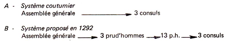 Mais, sur un point capital, une différence apparaît : mieux, une opposition radicale. En 1292, c’est l’universitas qui désignait les trois probi homines. Or, en 1307, ce sont les consuls et les conseillers seuls, qui le font. Et, la substitution, dans le règlement de 1307, du mot parlementum au mot universitas n’est pas un hasard. Il résume toute l’évolution.