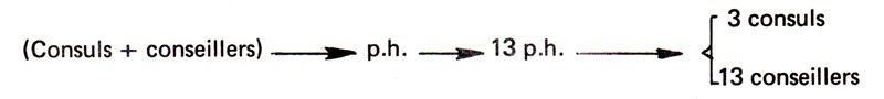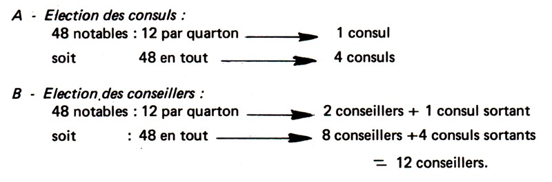 Cette procédure ressemble à celle que l’on a mentionnée plus haut, sauf qu’au lieu de porter sur l’élection des conseillers elle porte maintenant sur l’élection des consuls. Cependant, dans les deux cas, l’universitas est à l’origine du mécanisme qui, par une double ou triple élection, doit pourvoir la ville de ses dirigeants.