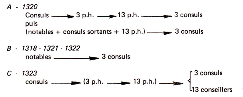 Ces dernières remarques montrent bien les imprécisions que présente encore l’élection consulaire entre 1318 et 1323. Malgré le franchissement d’une étape décisive – l’apparition des notables -, il manque encore pour aboutir au système final, tel qu’il apparaît en 1345, un dernier élément.