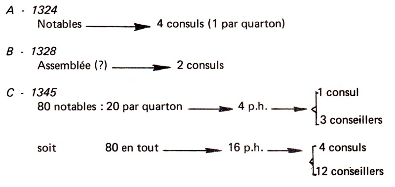 L’existence d’un corps de notables, les quatre consuls correspondant aux quatre « quartons », la désignation directe des consuls et des conseillers par les notables : tout ceci, sauf pour ce qui est du nombre, du recrutement et peut-être du rôle des conseillers, est une création médiévale qui, malgré les crises habituelles de l’histoire urbaine, a connu une très réelle longévité, signe d’adaptation aux besoins du temps.