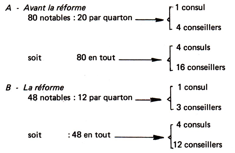 Les douze notables, dans chaque quartier, désigneront leurs trois conseillers, en prenant soin de nommer dans ce nombre le consul sortant « comme par avant faisoit » 75. La ville comptera donc douze conseillers et non plus seize.