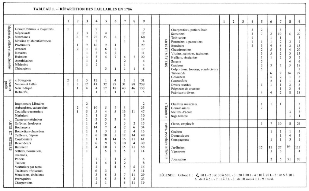 Apparaît très nettement une faible minorité très aisée, un corps important de fortune moyenne, constitué surtout par les marchands-artisans, une plèbe importante de tout petits chefs d’entreprise, à la limite du plancher de l’imposition. Artisanat d’entretien, artisanat archaïque, tel apparaît – corporé ou non – l’ensemble des métiers de Moulins.