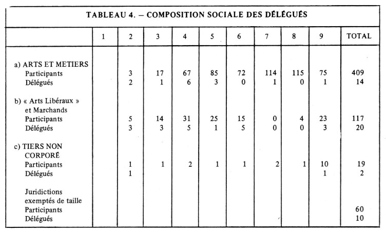 En principe, seuls les maîtres régulièrement inscrits ou réinscrits sur le registre des métiers postérieur à l’édit de rétablissement peuvent comparaître. Or bon nombre de maîtres qui ont négligé cette formalité comparaissent : 32 maçons sont présents alors qu’ils ne sont que 2 sur le registre. Seuls les ouvriers du fer mentionnent les agrégés. En l’absence du registre du 1/20eme d’industrie et de rôles pour l’année 1788 il faut recourir à la Taille de 1786. Bien des maîtres échappent à notre investigation, non encore inscrits. Le rôle comporte 475 maîtres de métiers corporés, ce sont eux qui comparaîtront entre le 2 et le 5 mars dans leurs assemblées préliminaires respectives. Les autres, artisans libres, boutiquiers, transporteurs comparaissent dans l’assemblée du Tiers non corporé de la ville. Seulement 7 d’entre eux le feront sur 378 inscrits en 1786. Le fait d’être organisé serait le premier facteur favorable pour la participation.