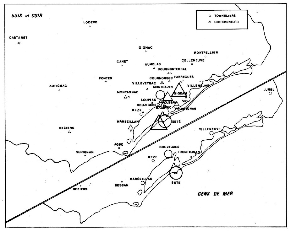 Plus précisément encore, l’analyse des contrats fait connaître la zone d’origine géographique des apprentis étrangers à Sète. Nous ne retiendrons que quelques métiers caractéristiques : c’est ainsi que les calfats-charpentiers de marine sont en grande majorité originaires des villes et villages bordant les étangs de Thau et de Vic : Marseillan, Mèze, Bouzigues, Frontignan ou Villeneuve. Les tonneliers viennent de l’intérieur des terres ainsi que les boulangers, les tailleurs ou les cordonniers-bourreliers : de Poussan, Gigean, Montagnac, Cournonterral, Montbazin, pour ne citer que quelques agglomérations.