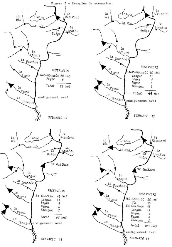 Par exemple, un des derniers scénarios testés, comportant : 7 petits barrages répartis sur l’ensemble du bassin avec un total de 123 Mm3, et un endiguement de la zone aval à partir de Saint Thibéry en rive droite et de Nézignan en rive gauche, aurait provoqué une diminution notable des inondations.