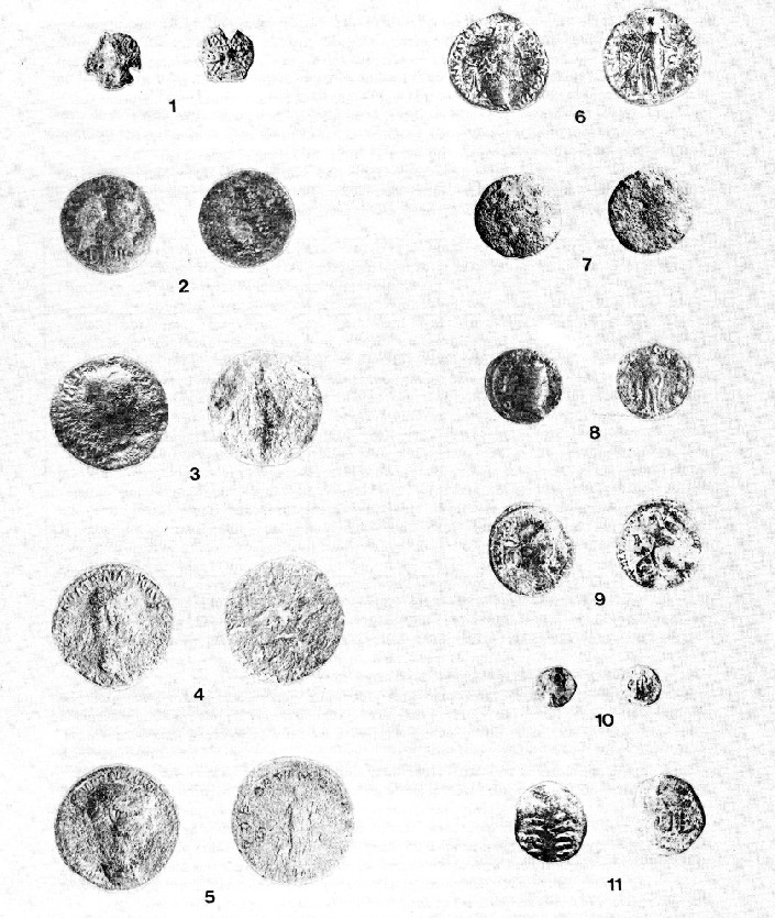 Les onze monnaies qui font l’objet de cette étude proviennent pour quatre d’entre elles, de deux sondages que nous avons effectués en 1977 sur l’éperon de Lique Castel, cette partie de l’oppidum d’Aumes qui surplombe directement la N. 109 1.