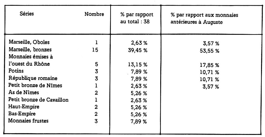 Il ne s’agit pas ici de reprendre les conclusions générales données par les auteurs de la précédente publication 13 : nous rappelons néanmoins que la circulation monétaire sur ce site, se présente de façon tout à fait comparable à celle d’autres oppida à l’Est de l’Hérault comme Ambrussum, Lattes, Nages…