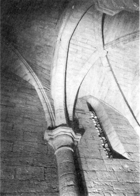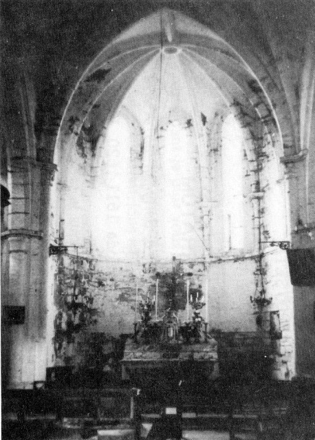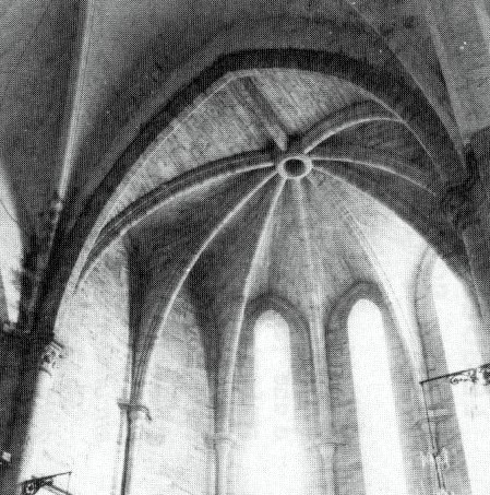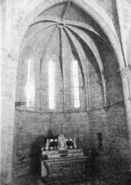 Ouvert par deux colonnes engagées, surmontées de chapiteaux au décor floral, le chœur présente sept pans de mur agrémentés d’une corniche et de colonnettes sur lesquelles prennent appui les arcs élancés de la voûte d’ogive. La présence de ces divers éléments décoratifs et les nombreux dommages causés par des gouttières, rendaient le travail plus difficile et plus captivant à la fois. Il fallut procéder au piquetage d’un mortier qui masquait les voûtes, au remplacement des pierres rongées par l’humidité et à leur brossage, opérations nécessaires avant de commencer à sabler.