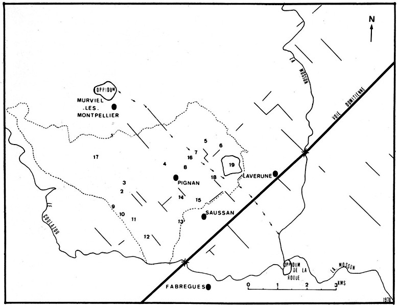 1 Le projet de réaliser le bilan des découvertes archéologiques de Pignan a reçu un accueil très favorable de toutes les personnes concernées, à l’exception de M. le Maire de Pignan. Nous tenons à adresser nos remerciements à M.G. Segondy qui e bien voulu nous permettre d’étudier le produit de ses prospections de surface, à M. L. Secondy, qui prépare une histoire de la commune, à M. le Dr J. M. Enjalbert, qui nous a autorisés à étudier les inscriptions conservées dans le château de Saint-Martin, à MM. L. Albagnac et D. Rouquette qui nous ont fait connaître leurs prospections, à M. le Professeur Grasset et à M. F. Genieys qui ont très libéralement autorisé des fouilles dans leur propriété et qui ont saisi tout l’intérêt de ces recherches, à MM. A. Colomer, P. Y. Genty et X. Gutherz des Directions régionales des Antiquités Préhistoriques et Historiques qui ont assuré ces fouilles et nous en ont confié le rapport, à MM. les Professeurs M. Chalon et M. Gayraud, de l’Université Paul Valéry, qui ont étudié les inscriptions, et, pour l’étude des monnaies, à MM. Y. Bertin, G. Depeyrot, M. Dhénin et F. Lavagne.