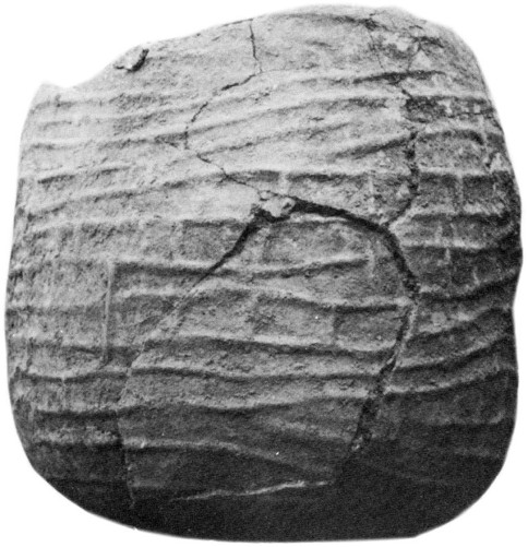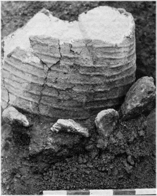 Il s’agit d’une grande jarre de forme ovoïde à fond convexe en céramique brune épaisse (1,5 à 2 cm) décorée sur toute la panse de cordons lisses encerclant le vase (Fig. 3). Ces cordons sont subhorizontaux et grossièrement parallèles. La distance entre les cordons varie de 2 à 5 cm. De temps à autre, de petits cordons verticaux joignent deux cordons horizontaux formant comme une échelle aux barreaux très irrégulièrement espacés. Des languettes de préhension sont situées sur un cordon dans la partie supérieure du vase. Leur nombre est inconnu. La hauteur totale du vase peut être estimée à 0,70 m environ alors que son diamètre au sommet de la panse est de 0,50 m. Sa contenance peut être considérée comme équivalent à environ 100 litres.