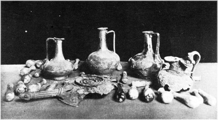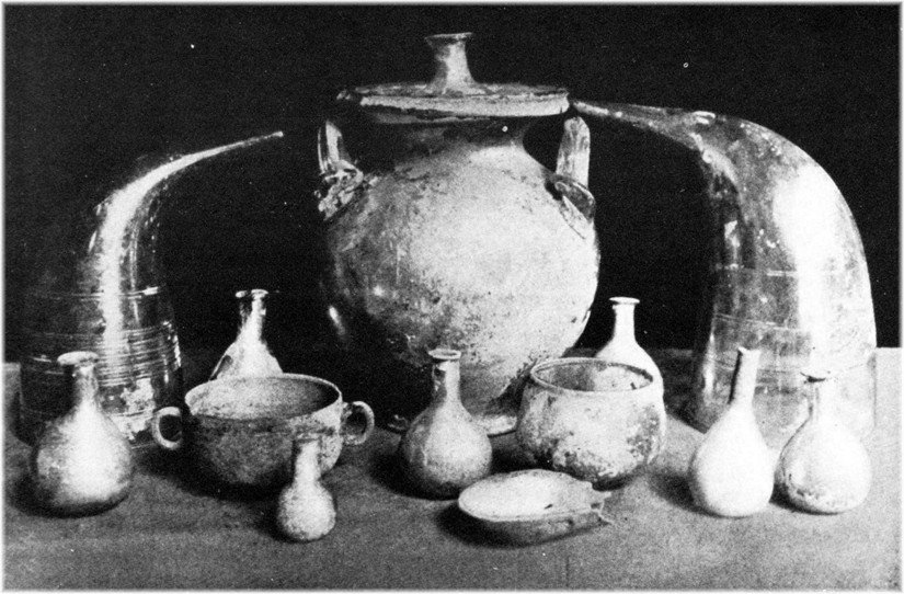 Déjà, en 1887, sans que le lieu précis soit connu, une riche tombe gallo-romaine à incinération, fut mise au jour à Pignan 9 (Fig. 6 et 7). Elle était contenue dans une auge en pierre, dont le couvercle était muni d’une feuillure, à l’intérieur de laquelle se trouvait un coffre cylindrique en plomb (33 cm de hauteur, 25 cm de diamètre : le couvercle a 3 cm de hauteur). Dans le coffre en plomb prenait place une urne (28 cm de hauteur avec son couvercle, 20 cm de diamètre), en verre épais, munie de deux fortes anses, qui avait recueilli les cendres du mort. Autour du chiffre en plomb et dans l’auge en pierre, se trouvaient des objets en poterie (une tasse avec une couverte sablée, une lampe à motif), des objets en métal (trois patères en bronze dont une avec un manche orné d’une tête de bélier, une aiguière en bronze 10, une boite à onguent en bronze, et, peut-être, des strigiles en fer), des objets en verre (deux grands rhytons, sortes de récipients en forme de corne, percés à la base (23 et 20 cm de hauteur, 40 et 30 cm de développement, une tasse, quatre flacons, huit petites fioles et une cinquantaine de petits récipients communément désignés sous le nom de lacrymatoires). Cette sépulture pourrait se placer à la fin du 1er siècle ou au début du IIe siècle ap. J.-C. : elle doit être mise en relation avec des découvertes semblables qui ont été faites à Murviel-les-Montpellier, à Lavanet (commune de Montpellier), à Saint-Paul-et-Valmalle, à Balaruc.