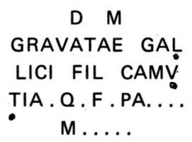 13 E. Espérandieu, op. cit., p. 164-165, n° 549. On peut restituer et compléter ainsi : D(is) M(anibus) Gravatae Gallici fil(iae) Camutia q(uae) f(ecit) pa [tronae] M(onumentum) [h(oc) h(ere dem) m(on) s(equitur)] et traduire : « Aux dieux mânes de Gravata, fille de Gallicus, Camutia qui a fait (ce monument) à sa patronne. Ce monument ne se transmet pas aux héritiers ». Nous devons à Monsieur M. Gayraud (Université Paul Valéry) lecture, traduction et datation. D’autres restitutions sont toutefois possibles.