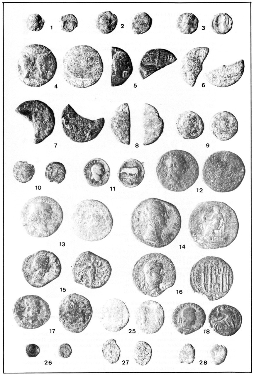 N° 16 : 13.55 g (léger manque) ; 27 ; 4 ; 1 (site n° 7) (H. Cohen, Description historique des monnaies frappées sous l’Empire romain, Paris, 5, 1885, p. 332, n° 357 ; Catalogue of Greek Coins in the British Museum, Londres, 1910, p. 287, n° 452. - IVe siècle ap. J.-C.