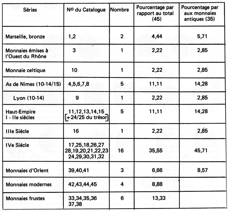 Le commentaire que l’on peut présenter de ce tableau doit être extrêmement nuancé car le total (45) reste très faible et, si on laisse à part les monnaies modernes et les monnaies frustes (10), notre base se réduit à 35 exemplaires. Or l’amplitude chronologique (cinq siècles au moins) et la concentration de 16 monnaies sur le IVe siècle ap. J.-C. rendent toute interprétation fort aléatoire par exemple, l’absence des séries courantes d’Auguste ou de Claude I ne semble due qu’au hasard des découvertes 27.