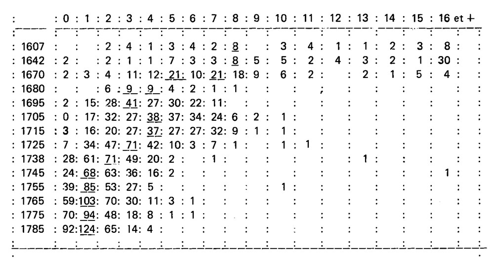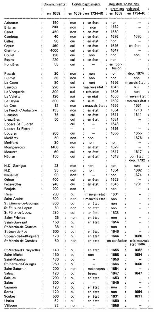 - La date où sont tenus les premiers registres paroissiaux est indiquée dans les Visites. Elle peut être la date réelle où les baptêmes, mariages, sépultures ont été notés, ou bien la date du premier registre que l’on n’a pas perdu ou qui est utilisable. En effet la plupart des relevés sont faits sur des cahiers dépourvus de couverture, ils sont tenus sans méthode et rapidement dégradés. Il est tout de même intéressant de noter que les rares paroisses qui possèdent des registres avant 1640 sont en général petites ; que la plupart des curés ont commencé à faire des relevés systématiques dans la décennie 1645-1655 ; qu’une bonne partie des paroisses ont perdu, lors des Visites de Monseigneur de Souillac, les plus anciens registres conservés en état 80 ans plus tôt. Ces faits donnent la mesure de l’inertie considérable de l’appareil clérical. En pays d’Oc, un siècle après l’édit de Villers-Cotterets, 10 % environ des églises du diocèse de Lodève ont des relevés d’État-Civil qui puissent être montrés.